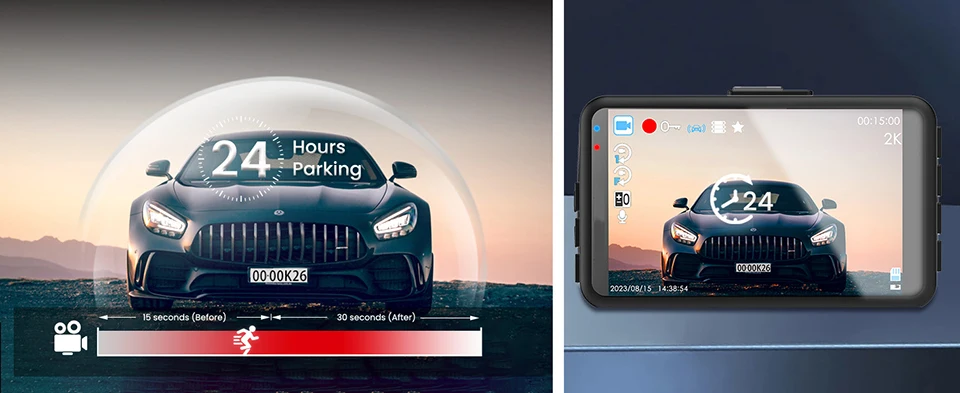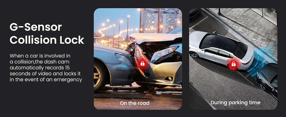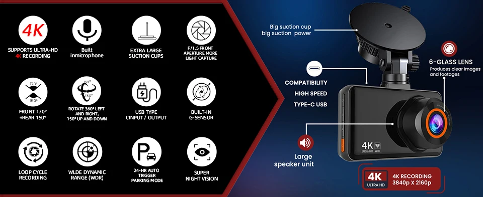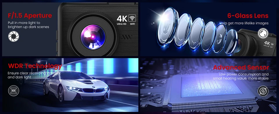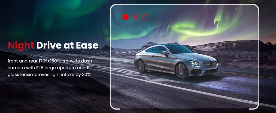 front and rear 170°+150°ultra wide dashcamera with F1.5 large aperture and 6glass lensimproves light intake by 30%