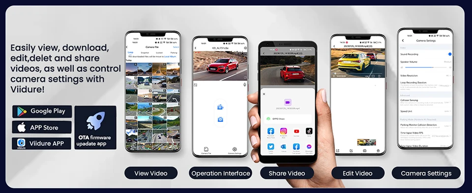 Easily view, download,edit,delet and sharevideos, as well as controlcamera settings withViidure!